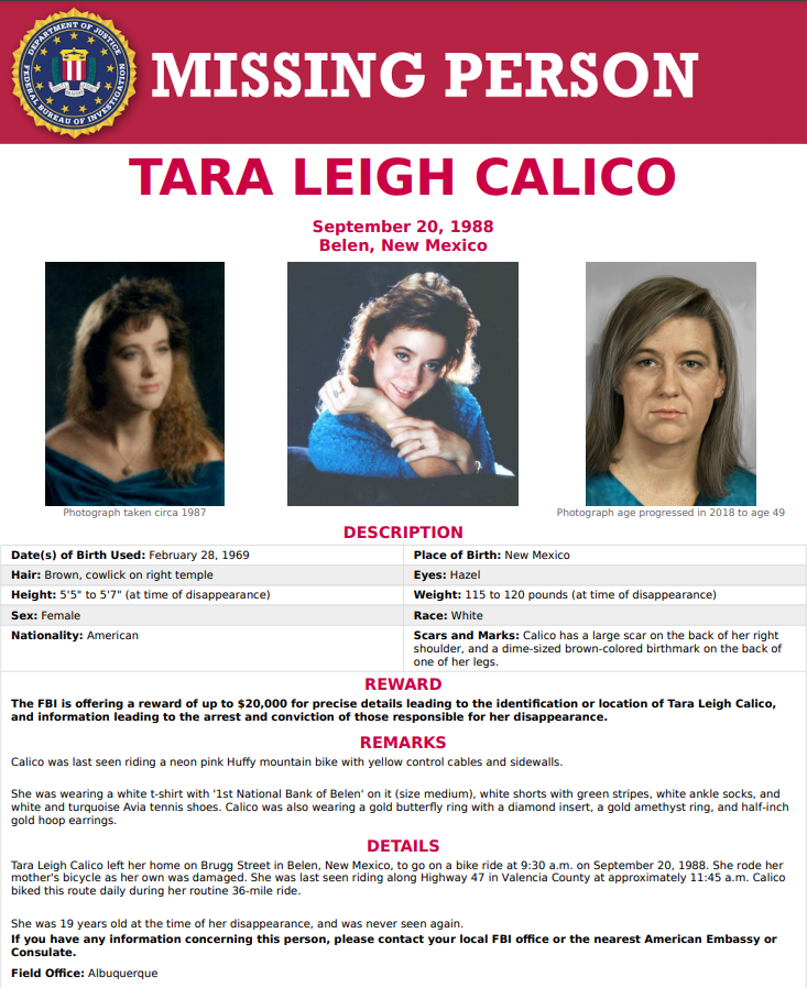 NOVO MÉXICO, 1988 - Tara estava saindo de casa para andar de bicicleta, assim como fazia todos os dias. Ela pediu pra sua mãe, Pati, que, caso ela não voltasse antes do meio dia, era pra Pati buscá-la ao longo de sua rota; Tara gostava tanto de exercícios ao ar livre, que era capaz de perder a hora e faltar em seus compromissos a tarde. Meio dia chega e Tara não volta. Sua mãe sai à sua procura, mas não a encontra. O que aconteceu com Tara Calico?